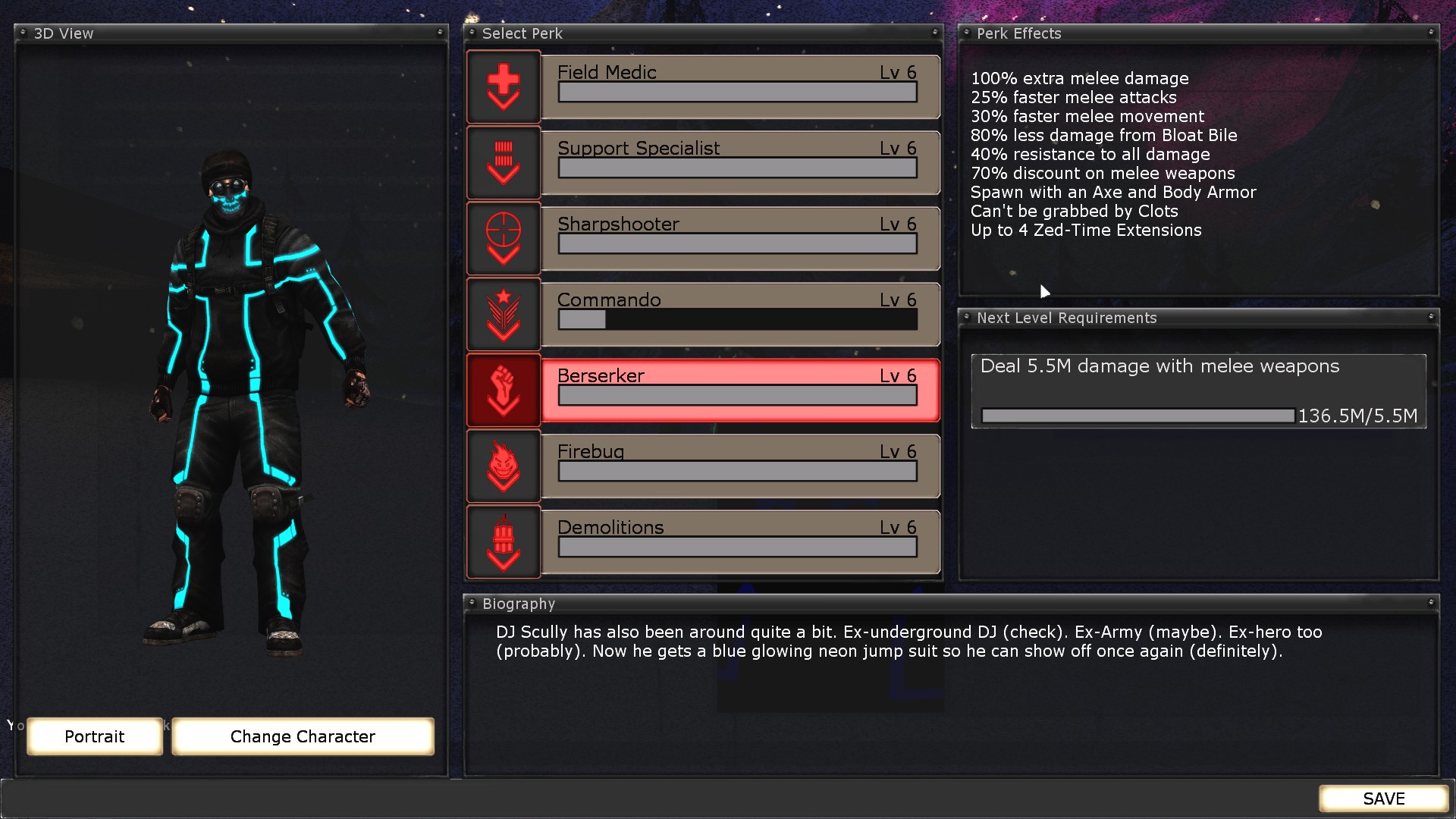 Maximum level of perks is 6 by the way 1. The sharpshooter is the far end of the commando gunslinger sharpshooter continuum trading the rate and fire and mobility of the other perks for increased damage and accuracy especially at long range. The sharpshooter is the sniper striking his foes from afar destroying zed after zed with well placed headshots. The medic is a fast running strong armor tank with ranged healing alt fire on medical weapons as well as close healing syringe it will spawn with armor from level 5 and above.